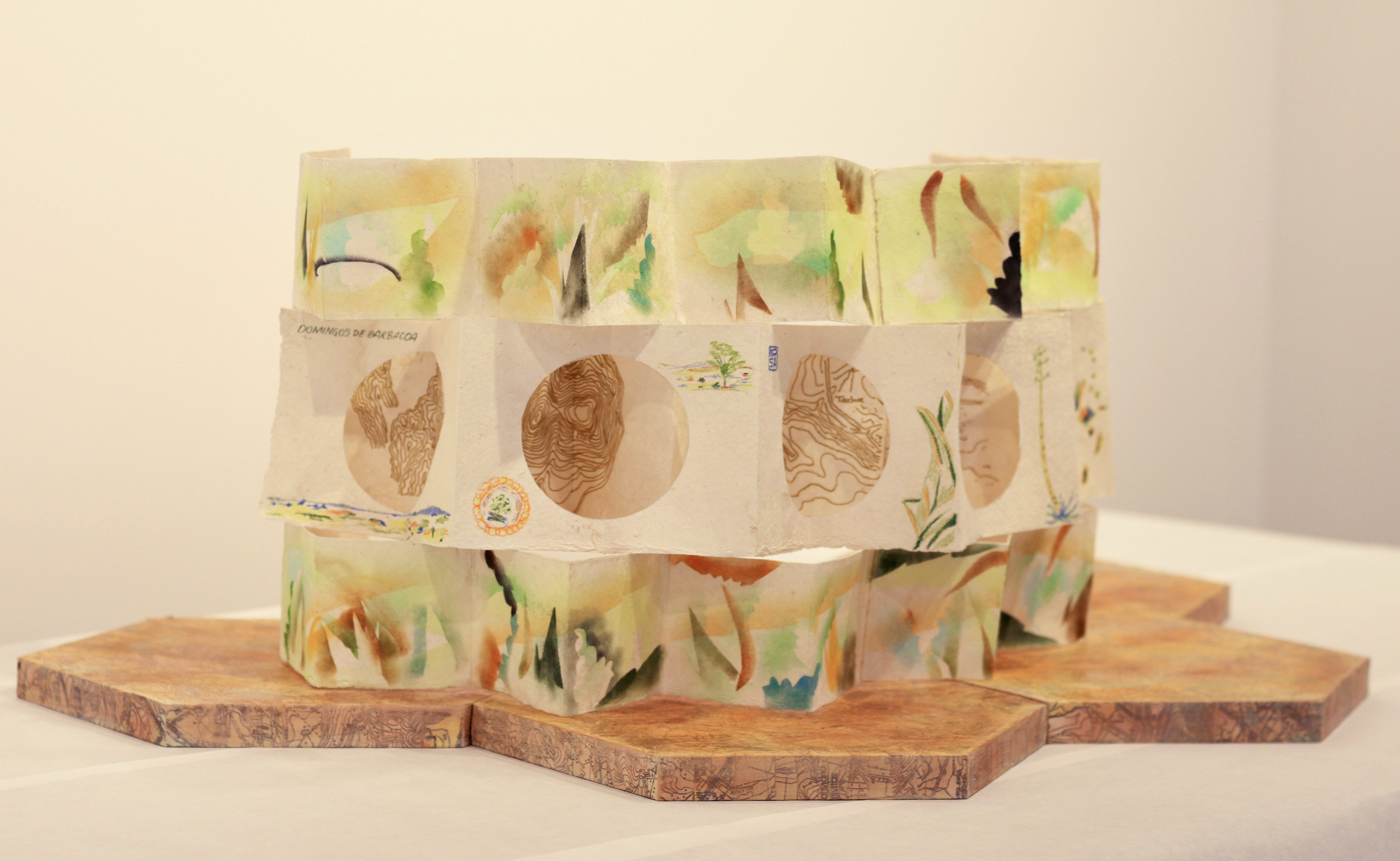 La parcela de Toño is a sculptural artist’s book that, when displayed, takes the form of a barbacoa pit. The book contains drawings of the topography of a parcel of land granted through Mexico’s “Reforma Agraria” to the artist’s father, Toño, alongside abstracted patterns derived from agave leaves and references to barbacoa. Minimal text appears only in fragments, allowing the work to function as a material record of land, labor, and family ritual. The piece connects territory, plant, and cooking as intertwined systems of memory and care.