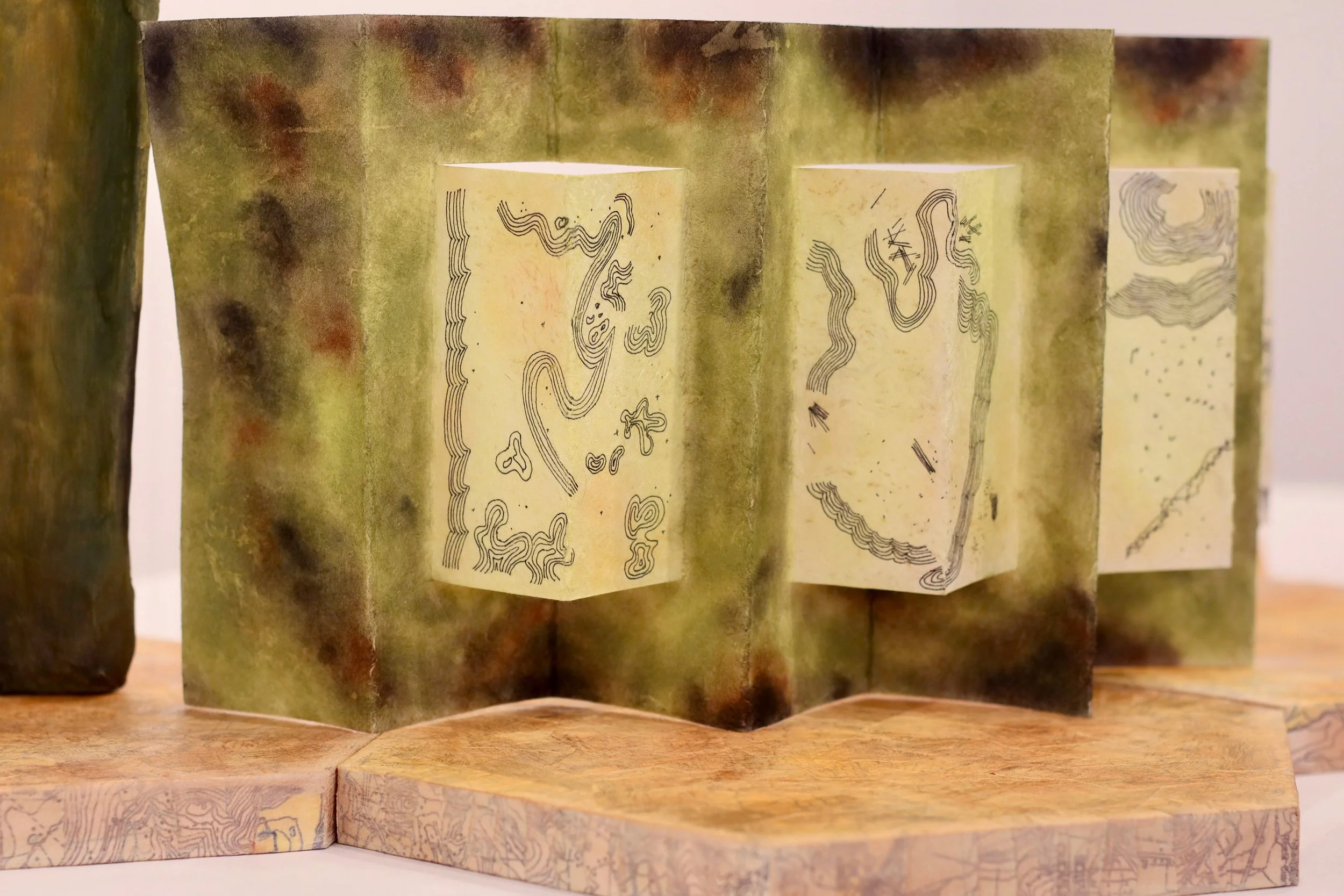 Pencagrafía is an accordion book composed of smoke-toned and olive-green pages that echo the color of a burned agave penca. At the center of each fold, small abstract drawings emerge from microscope images of agave leaves. Cellular structures are translated into topographic forms, transforming microscopic observation into a shifting landscape. The book format presents the maguey as both a biological body and a landscape.